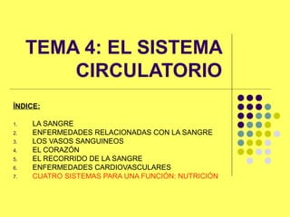 Este documento trata sobre el sistema circulatorio y contiene 7 secciones. Resume que la sangre está compuesta de plasma y células sanguíneas como glóbulos rojos, blancos y plaquetas. Describe 3 tipos de vasos sanguíneos y explica que el corazón bombea la sangre a través de un circuito pulmonar y uno general. Finalmente, detalla algunas enfermedades cardiovasculares y cómo la nutrición requiere la coordinación del sistema circulatorio con los sistemas digestivo, respiratorio y urinario.