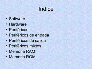 Este documento describe los componentes básicos de un sistema informático, incluyendo el software, hardware, periféricos de entrada y salida, y tipos de memoria. Explica que el software controla el funcionamiento de la computadora, mientras que el hardware incluye la unidad central y periféricos físicos. También distingue entre periféricos de entrada, como teclados y mouse, periféricos de salida como monitores, e incluye periféricos mixtos.