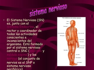 El sistema nervioso es el rector y coordinador de todas las actividades del organismo. Está formado por el sistema nervioso central (encéfalo y médula espinal) y el sistema nervioso periférico. El sistema nervioso central realiza las funciones más altas como detectar estímulos, transmitir información y coordinar el cuerpo. El cerebro es el órgano clave que rige la sensibilidad, los movimientos, la inteligencia y el funcionamiento de los órganos a través del procesamiento de información.