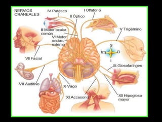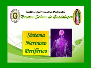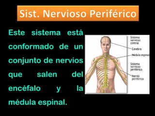 El sistema nervioso periférico está formado por nervios que salen del encéfalo y la médula espinal. Los nervios pueden ser sensitivos, motores o mixtos dependiendo de su función, y pueden ser craneales u espinales dependiendo de su origen.