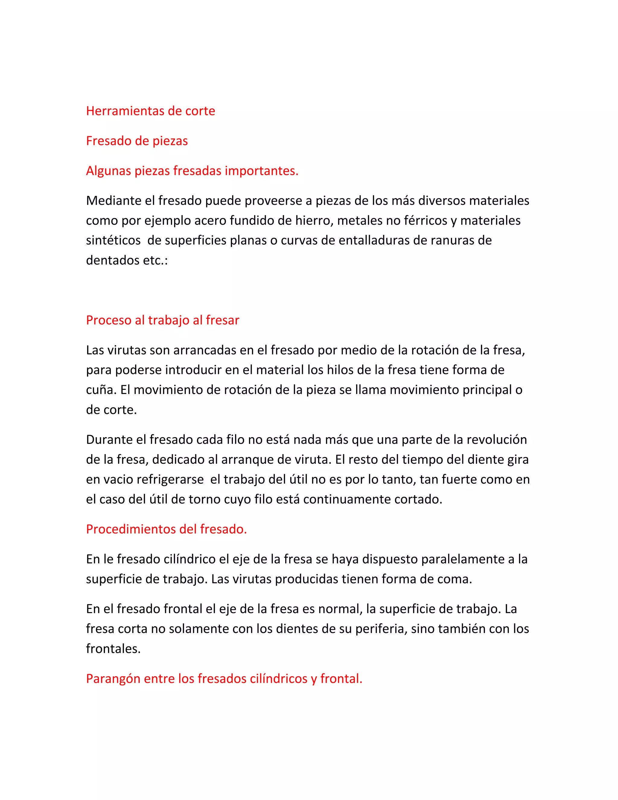 Este documento describe los procesos y maquinaria de fresado. Explica que el fresado se usa para dar forma a piezas de diversos materiales mediante el uso de fresas rotativas. También describe los diferentes tipos de maquinaria de fresado como fresadoras horizontales, verticales y universales, así como los diferentes tipos de fresas y cómo se sujetan correctamente.