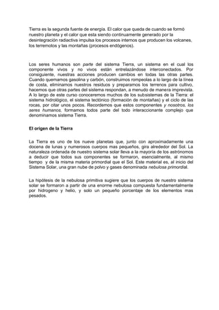 El documento describe la Tierra como un sistema complejo compuesto de subsistemas interrelacionados e interdependientes como la hidrosfera, la atmósfera y la biosfera. Explica que la Tierra se formó hace aproximadamente 4,500 millones de años a partir de una nebulosa primordial que dio origen al sistema solar. A medida que la nebulosa se contrajo y giró, se formaron los planetas como resultado de la acreción y colisión de fragmentos rocosos y de gases. La Tierra retuvo agua liquida en su superficie debido a su