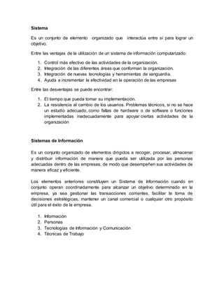 Un sistema se define como un conjunto de elementos organizados que interactúan entre sí para lograr un objetivo. Un sistema de información es un conjunto organizado de elementos dirigidos a recoger, procesar, almacenar y distribuir información de manera que pueda ser utilizada por las personas adecuadas dentro de las empresas. Los sistemas de información incluyen información, personas, tecnologías de información y comunicación, y técnicas de trabajo. Algunos tipos de sistemas de información son los sistemas de trabajo en grupo, los sistemas de automatización de of