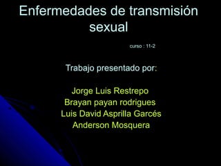 Este documento resume las principales enfermedades de transmisión sexual como la gonorrea, la sífilis, la clamidia, el virus del papiloma humano, el herpes genital, la tricomoniasis y el chancro. Describe los síntomas, causas y tratamientos de cada una de estas enfermedades.