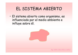 El documento describe las organizaciones como sistemas abiertos. Explica que los sistemas abiertos interactúan con su entorno y están compuestos de subsistemas interdependientes. Las organizaciones, al igual que los organismos vivos, se adaptan a su entorno, crecen en complejidad a medida que crecen, e intercambian materia e información con su entorno para mantener un estado estable.