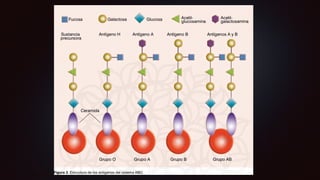 El documento describe los sistemas sanguíneos ABO y Rh. El sistema ABO incluye 4 grupos (A, B, AB, O) definidos por la presencia o ausencia de los antígenos A y B. El sistema Rh incluye 5 antígenos principales (D, C, E, c, e) y define si una persona es Rh positivo o negativo. La incompatibilidad entre los grupos sanguíneos de la madre y el feto puede causar enfermedades como la eritroblastosis fetal.