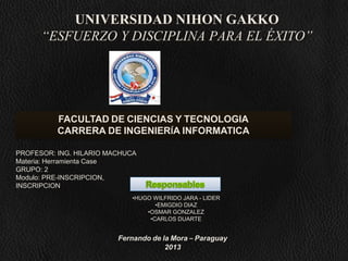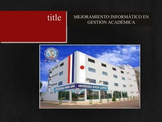 Este documento describe el desarrollo de un sistema de gestión académica para la Universidad Nihon Gakko. En primer lugar, se realizó un relevamiento que incluyó entrevistas con los usuarios para comprender los requerimientos y procesos actuales. Luego, en la fase de análisis y diseño se desarrollaron varios modelos como el de negocio, requerimientos, casos de uso, clases, secuencia y despliegue para el nuevo sistema. Finalmente, se presentó una propuesta formal al cliente que incluía el alcance