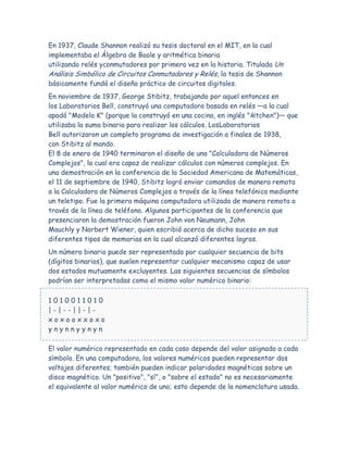 El sistema binario representa números utilizando solo los dígitos 0 y 1. Fue desarrollado por matemáticos antiguos como los indios y chinos, y documentado por Leibniz en el siglo XVII usando los símbolos 0 y 1 actuales. Las computadoras usan el sistema binario internamente debido a que trabajan con dos niveles de voltaje.