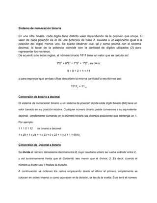 El sistema binario representa números utilizando solo los dígitos 0 y 1. Es el sistema de numeración usado en computadoras debido a que estas trabajan internamente con dos niveles de voltaje (encendido y apagado). Los números binarios pueden convertirse a decimales sumando los valores de cada dígito basado en su posición, y viceversa mediante la división sucesiva entre 2.