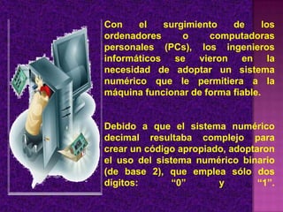 Los ingenieros informáticos adoptaron el sistema binario para el funcionamiento de los ordenadores debido a que sólo requiere dos dígitos ("0" y "1") en lugar del complejo sistema decimal. Esto permitió crear un lenguaje de bajo nivel que los ordenadores pueden entender fácilmente. El sistema binario representa números mediante potencias de dos, lo que los hace más simples de procesar para los circuitos electrónicos de una computadora.