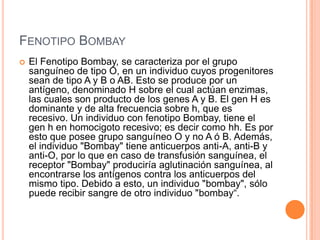 Este documento describe el fenotipo Bombay, un tipo raro de grupo sanguíneo. Las personas con fenotipo Bombay tienen el gen h en homocigosis recesiva (hh) y carecen de los antígenos A, B y H. Como resultado, producen anticuerpos contra A, B y H de forma natural. Estas personas sólo pueden recibir transfusiones de sangre de otros individuos con fenotipo Bombay, ya que su sangre es incompatible con todos los demás grupos sanguíneos. El documento también explica que el locus Hh regula la actividad del locus ABO