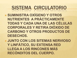 El sistema circulatorio consta del corazón, los vasos sanguíneos y la sangre. El corazón bombea la sangre a través de las arterias hasta los capilares, donde se intercambian oxígeno y nutrientes con los tejidos. Luego, la sangre regresa al corazón a través de las venas. El sistema circulatorio transporta oxígeno, nutrientes y hormonas a todas las células del cuerpo, y recoge dióxido de carbono y desechos para su eliminación.