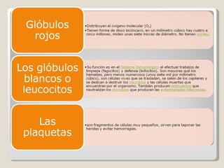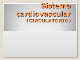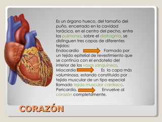 El documento describe el sistema cardiovascular, incluyendo la estructura y función del corazón, los vasos sanguíneos y la circulación de la sangre. El corazón está formado por dos ventrículos y dos aurículas que bombean la sangre a través de las arterias, capilares y venas. La sangre fluye desde el corazón a través de las arterias, pasa a los capilares para intercambiar oxígeno y dióxido de carbono con los tejidos, y regresa al corazón a través de las venas.