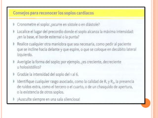 Este documento describe los principales síntomas y signos del sistema cardiovascular, incluyendo disnea, dolor, palpitaciones, síncope, edema, cianosis y otros. Explica cómo evaluar estos síntomas y signos para diagnosticar condiciones cardiovasculares como insuficiencia cardíaca, infarto de miocardio y otras.