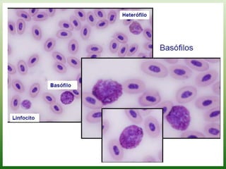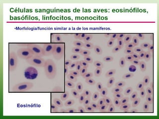 Este documento resume el sistema cardiovascular de las aves. Describe que las aves tienen un corazón de cuatro cámaras como los mamíferos, pero que sus glóbulos rojos contienen núcleo. Explica las funciones básicas del sistema como transporte de oxígeno y nutrientes. También describe los componentes principales como el corazón, vasos sanguíneos, y tipos de células en la sangre como eritrocitos y leucocitos.