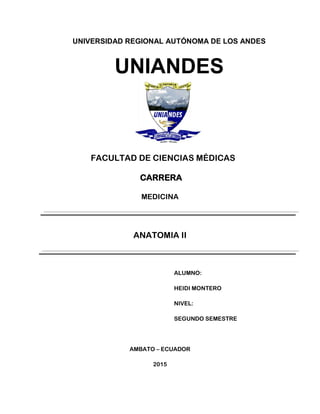 El documento describe la anatomía y fisiología de la circulación sanguínea. Explica que el corazón bombea la sangre a los pulmones para oxigenarse y al resto del cuerpo para distribuir oxígeno y nutrientes y recoger dióxido de carbono. Describe las circulaciones mayor, menor y portal, así como las estructuras del corazón como las aurículas, ventrículos, válvulas y principales vasos sanguíneos.