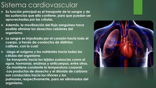 El documento describe el sistema cardiovascular. Explica que su función principal es transportar la sangre por todo el cuerpo a través de arterias, venas y capilares para llevar oxígeno y nutrientes a las células y eliminar desechos. Describe las partes del corazón como aurículas, ventrículos, válvulas y vasos sanguíneos. Explica el ciclo cardíaco, circulación de la sangre a través del corazón y el cuerpo, y otros aspectos clave del sistema.