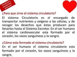 El sistema circulatorio está formado por el corazón, los vasos sanguíneos y la sangre. Transporta nutrientes, oxígeno y hormonas a las células y recoge desechos celulares, llevándolos al sistema excretor. La sangre circula a través del corazón y los vasos sanguíneos, proporcionando oxígeno y nutrientes a todo el cuerpo.