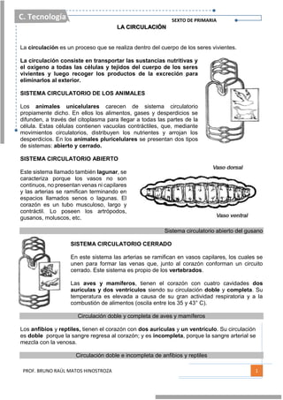 Este documento describe los sistemas circulatorios de varios organismos, incluyendo humanos. Explica que la circulación transporta nutrientes y oxígeno a las células y recoge desechos. Describe los sistemas circulatorios abierto y cerrado en animales, y cómo varian entre peces, anfibios, reptiles, aves y mamíferos. También cubre la circulación en plantas y el sistema circulatorio humano, incluyendo el corazón, vasos sanguíneos y circulación de la sangre.