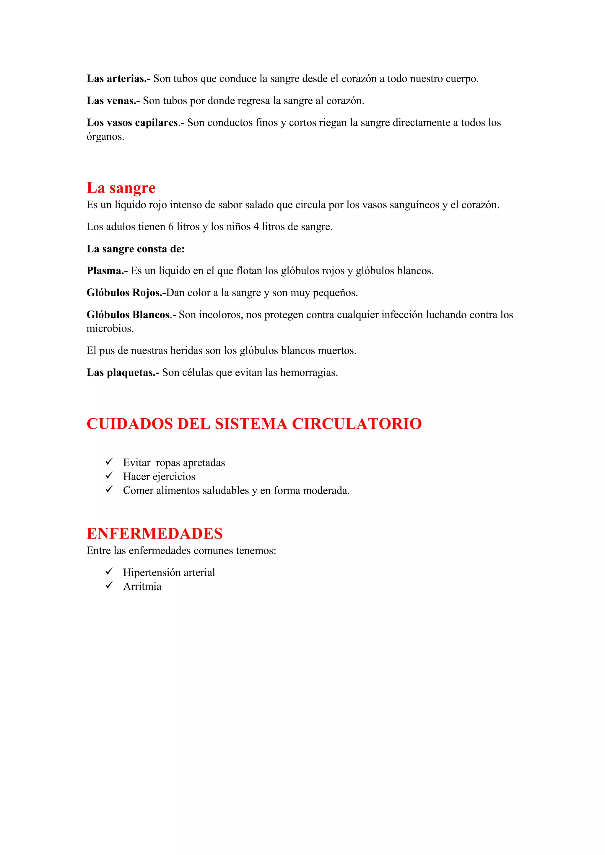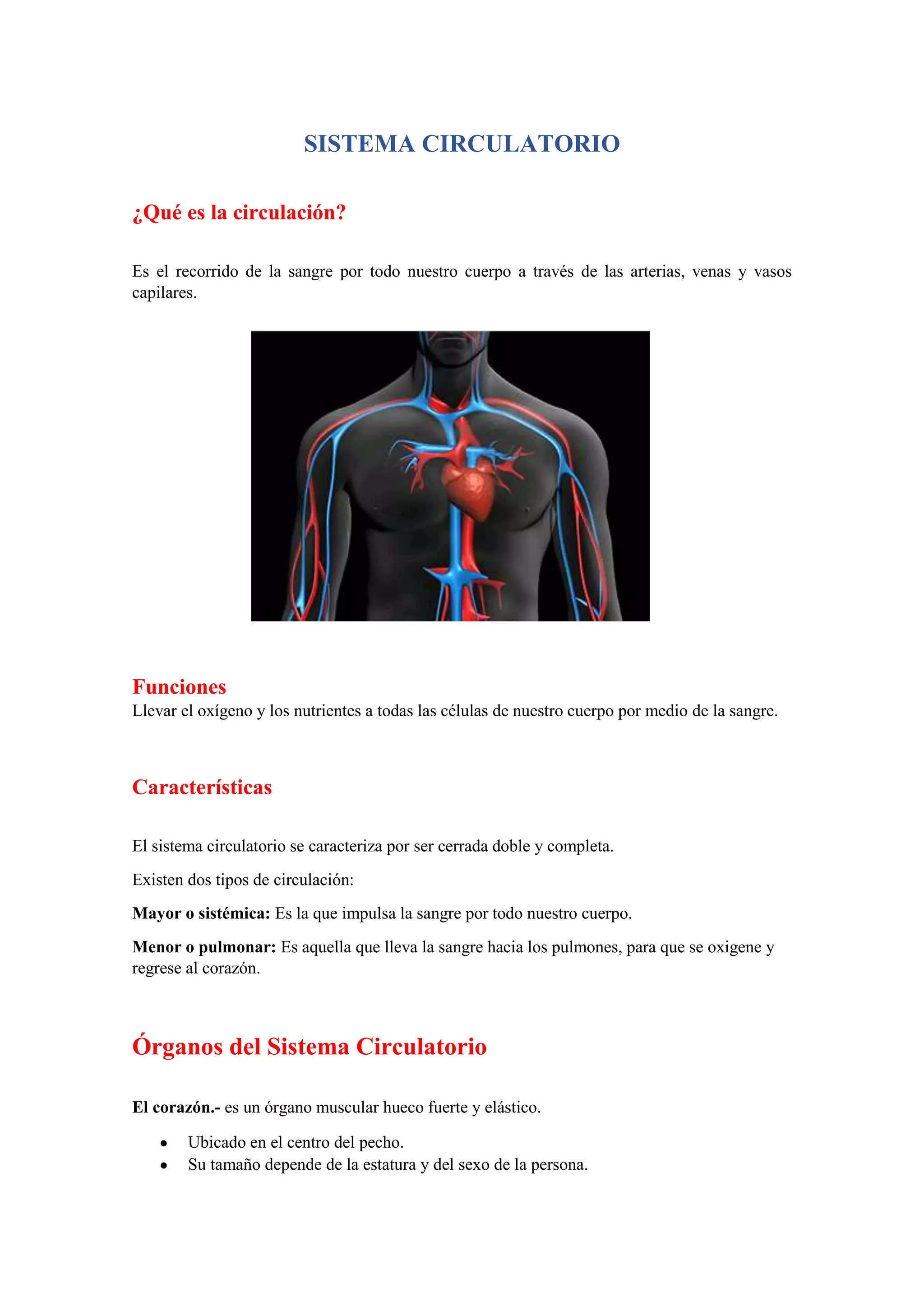 El sistema circulatorio transporta la sangre rica en oxígeno y nutrientes desde el corazón a través de las arterias, y devuelve la sangre pobre en oxígeno a través de las venas. Consta del corazón, las arterias, las venas, los vasos capilares, y la sangre, que contiene glóbulos rojos, glóbulos blancos y plaquetas. El sistema circulatorio se caracteriza por ser cerrado y doble, con una circulación mayor que transporta la sangre por el cuerpo y una circulación menor que la lleva a