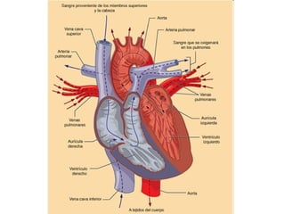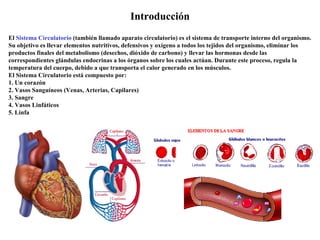 El documento proporciona una introducción al sistema circulatorio humano, describiendo sus principales componentes (corazón, vasos sanguíneos, sangre), sus circuitos mayor y menor, y el flujo de la sangre a través del corazón y el cuerpo. Explica que el corazón bombea la sangre a través de las arterias, luego a los capilares para el intercambio de gases y nutrientes con los tejidos, y finalmente a las venas para regresar al corazón.
