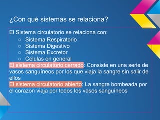 El sistema circulatorio se relaciona con los sistemas respiratorio, digestivo y excretor, y transporta la sangre a través de los vasos sanguíneos. Las arterias transportan sangre oxigenada desde el corazón a los tejidos, mientras que las venas transportan sangre desoxigenada de regreso al corazón. Las venas varicosas ocurren cuando las venas se hinchan debido a la obstrucción de trombos, y se pueden prevenir haciendo ejercicio, evitando estar parado por largos períodos y usando ropa