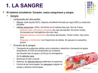 Este documento trata sobre el sistema circulatorio y contiene 7 secciones. Resume que la sangre está compuesta de plasma y células sanguíneas como glóbulos rojos, blancos y plaquetas. Describe 3 tipos de vasos sanguíneos y explica que el corazón bombea la sangre a través de un circuito pulmonar y uno general. Finalmente, detalla algunas enfermedades cardiovasculares y cómo la nutrición requiere la coordinación del sistema circulatorio con los sistemas digestivo, respiratorio y urinario.