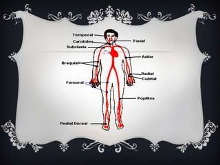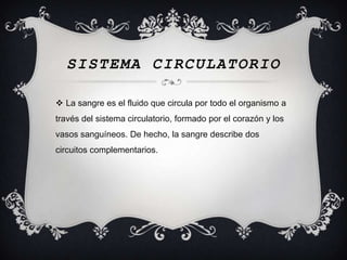 El documento proporciona una descripción general del sistema circulatorio. Explica que la sangre circula a través del corazón y los vasos sanguíneos en dos circuitos, la circulación pulmonar y la circulación sistémica. Describe que el corazón bombea la sangre de forma continua a través de las arterias, capilares y venas, llevando oxígeno y nutrientes a las células y recogiendo desechos. La sangre está compuesta de plasma, glóbulos rojos, glóbulos blancos y plaquetas,