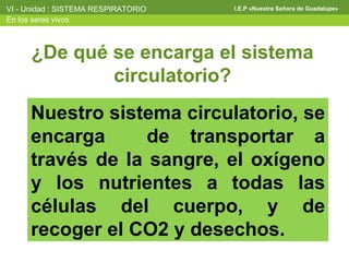 El documento describe el sistema respiratorio y circulatorio. Explica que el sistema circulatorio transporta oxígeno y nutrientes a las células a través de la sangre y recoge dióxido de carbono y desechos. Describe la anatomía del corazón, venas, arterias y capilares. Explica el recorrido de la sangre a través del cuerpo y los componentes de la sangre como la hemoglobina, plasma y diferentes tipos de células sanguíneas.