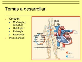 El documento resume la morfología, histología, fisiología y regulación del corazón. El corazón tiene cuatro cavidades, dos aurículas y dos ventrículos separados. Bombea la sangre en un circuito cerrado y doble a través de los pulmones y el cuerpo. Su actividad se regula a través de los nodos sinoatrial y auriculoventricular y el sistema nervioso y endocrino.