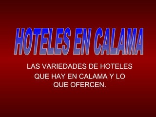 El documento describe tres hoteles populares en Calama, Chile - el Hotel Diego de Almagro, el Park Hotel y el Hotel Aguas del Desierto. El Hotel Diego de Almagro ofrece 146 habitaciones para ejecutivos y seis salones de eventos. El Park Hotel se encuentra cerca del aeropuerto y ofrece vistas del desierto de Atacama. El Hotel Aguas del Desierto está ubicado en un oasis de 18,000 metros cuadrados a 5 minutos del centro de la ciudad.