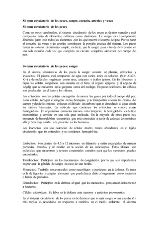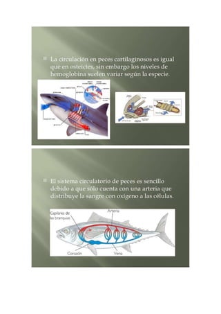 El sistema circulatorio de los peces es cerrado y simple, con la sangre pasando a través del corazón en un solo circuito. El corazón típicamente consta de cuatro partes - el seno venoso, el atrio, el ventrículo y el bulbo arterioso. La sangre fluye desde el corazón a las branquias para oxigenarse, luego al resto del cuerpo a través de arterias, y regresa al corazón a través de venas.