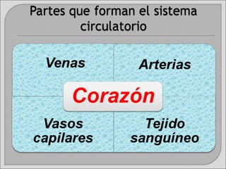 El sistema circulatorio transporta la sangre por todo el cuerpo a través de las venas, arterias y vasos capilares. La sangre es transportada desde el corazón a los pulmones para oxigenarse y luego es bombeada a todas las células a través de la circulación mayor y menor. El sistema circulatorio también transporta nutrientes, defiende el cuerpo contra infecciones, ayuda en la coagulación de la sangre y regula la temperatura corporal.
