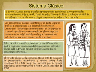 El documento habla sobre el Sistema Clásico de pensamiento económico, cuyos principales exponentes fueron Adam Smith, David Ricardo, Thomas Malthus y John Stuart Mill. Explica las contribuciones de estos economistas clásicos como la ley del valor, la división del trabajo y las teorías sobre el crecimiento económico. También resume brevemente las obras y teorías de cada uno de estos pensadores.