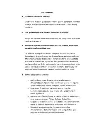 Este documento contiene las respuestas de William Mesa, un estudiante de décimo grado, a un cuestionario sobre sistemas de archivos. William define términos clave como archivo, programa, documento y carpeta. Explica que los archivos se organizan de forma jerárquica en una estructura de árbol con una carpeta raíz y subcarpetas y que se pueden realizar operaciones como crear, abrir, cerrar y borrar archivos. Además, menciona que los sistemas modernos protegen los archivos mediante permisos