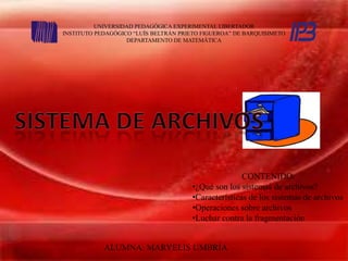 Este documento describe los sistemas de archivos, sus características y operaciones básicas como crear, borrar, abrir y cerrar archivos. También explica cómo la fragmentación de archivos puede afectar el rendimiento y cómo diferentes sistemas de archivos como Ext2 intentan minimizar la fragmentación. Finalmente, señala que para desfragmentar otros sistemas de archivos además de Ext2, es necesario guardar primero el sistema de archivos antes de volver a crearlo y restaurar los archivos.