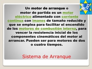 El sistema de arranque consta de un motor eléctrico, batería, interruptor e interruptor. El motor de arranque conecta al cigüeñal a través de un piñón bendix. Al girar la llave, el motor de arranque gira el cigüeñal para encender el motor. Una vez que el motor térmico comienza a girar más rápido, el piñón bendix se desacopla para evitar daños. El propósito del sistema es proporcionar una fuerza externa para girar el cigüeñal y enc