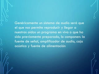Este documento describe los componentes principales de un sistema de audio, incluyendo la fuente de señal, amplificador de audio, caja acústica y fuente de alimentación. Explica que la fuente de señal proporciona la señal de audio original en forma de pequeñas señales eléctricas, y que el amplificador amplifica estas señales para excitar adecuadamente el parlante. También describe los diferentes tipos de parlantes y cajas acústicas, y cómo cada componente trabaja junto para permitir que el sonido llegue a n