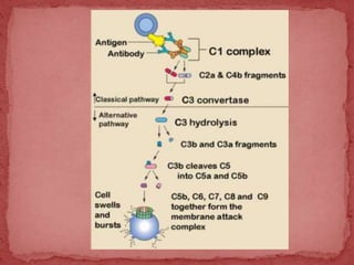 El documento describe el sistema del complemento, un mecanismo de defensa del sistema inmune. Consiste en alrededor de 20 proteínas que se activan en cascada a través de tres vías: la clásica, la alternativa y la de las lectinas. Todas estas vías conducen a la formación de la enzima C3 convertasa, que convierte C3 en C3b y C3a. El sistema del complemento ayuda a eliminar patógenos a través de opsonización, quimiotaxis, lisis celular y otros efectos inflamatorios.
