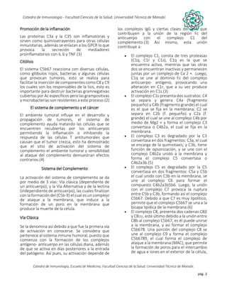 El documento describe las tres vías del sistema de complemento: la vía clásica, la vía alternativa y la vía de la lectina. Explica que estas vías involucran proteínas plasmáticas que se activan de forma secuencial para formar el complejo de ataque a la membrana (MAC), el cual crea poros que lisan la célula. También describe las funciones del complemento, como mejorar la defensa contra infecciones, promover la opsonización, inducir inflamación y citólisis.