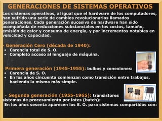 El documento resume las generaciones de sistemas operativos desde la generación cero hasta la quinta generación, describiendo las características clave de cada una. También analiza los sistemas operativos más utilizados actualmente, siendo Windows XP el líder con un 73% de uso, seguido de Windows Vista con un 17.9%. Además, describe la historia y características del sistema operativo Mac OS.