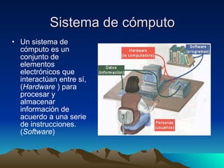 Un sistema de computo consiste en hardware y software que interactúan para procesar y almacenar información según instrucciones. El hardware son los componentes físicos como el monitor y disco duro, mientras que el software son programas como Microsoft Word, Excel y PowerPoint que nos ayudan con tareas como escribir y hacer cálculos. Los datos son representaciones simbólicas que reciben procesamiento para ser usados en cálculos o decisiones, mientras que los usuarios y administradores son las personas que usan y mantienen el sistema.