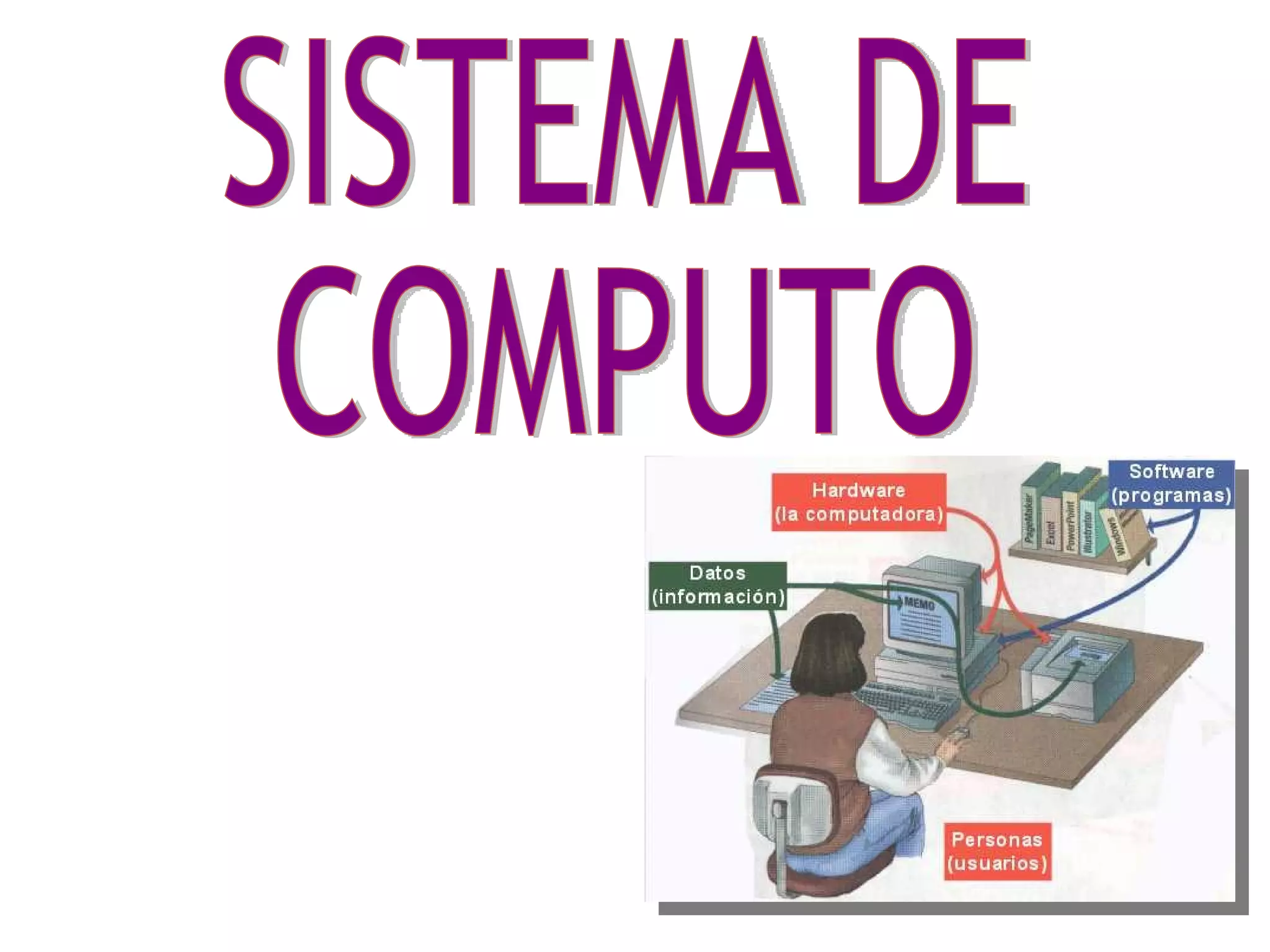 Este documento describe los componentes principales de un sistema de computo. Un sistema de computo consta de hardware y software. El hardware incluye dispositivos de entrada, salida, procesamiento y almacenamiento como teclados, monitores, microprocesadores y unidades de almacenamiento. El software incluye sistemas operativos, aplicaciones y utilerías que permiten a la computadora funcionar y ser útil.