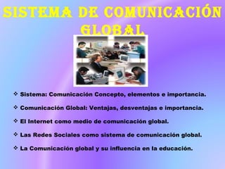 Este documento trata sobre los sistemas de comunicación global e Internet. Explica que la comunicación global permite transmitir ideas entre emisor y receptor en cualquier parte del mundo, con ventajas como la interacción en tiempo real pero también desventajas como la suplantación de identidad. Señala que Internet y las redes sociales son medios de comunicación global que facilitan el aprendizaje a distancia de forma accesible.