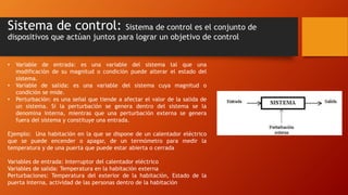 Este documento describe los conceptos básicos de un sistema de control. Define las variables de entrada, salida y perturbación de un sistema, y proporciona el ejemplo de un calentador eléctrico en una habitación. Explica la diferencia entre un lazo de control abierto y cerrado, y enumera los elementos clave de un sistema de control automatizado en lazo cerrado, incluido el regulador, transductor, comparador y accionador.