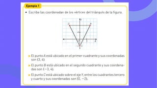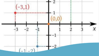 El documento describe los sistemas de coordenadas cartesianas. Explica que el plano cartesiano está formado por dos rectas perpendiculares graduadas, el eje horizontal X y el eje vertical Y, que se cortan en el origen O. También indica que una pareja ordenada de números racionales (x, y) tiene coordenadas x e y que son números racionales y cómo graficarlas dividiendo las unidades de acuerdo a las fracciones.
