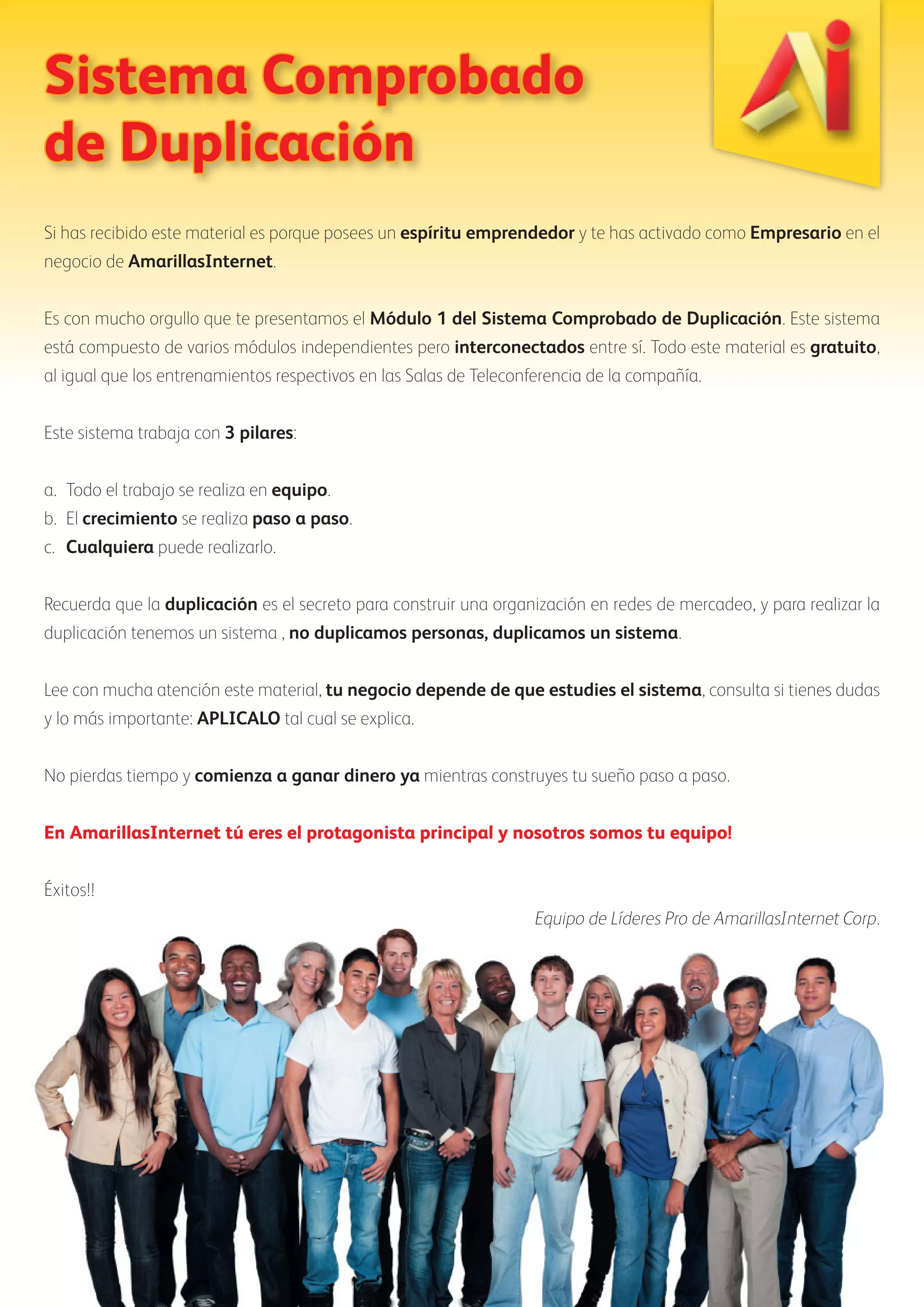 Este documento presenta el Módulo 1 del Sistema Comprobado de Duplicación de AmarillasInternet. Explica que el sistema funciona en equipo y de manera gradual, y que cualquiera puede realizarlo siguiendo el sistema en lugar de duplicar personas. Detalla los tres pasos iniciales que un nuevo miembro debe seguir: 1) completar una lista de contactos, 2) elegir un Up-line para trabajar en equipo, 3) participar en llamadas conjuntas con el Up-line para presentar el sistema. El objetivo es aprender el proceso para luego ayudar a