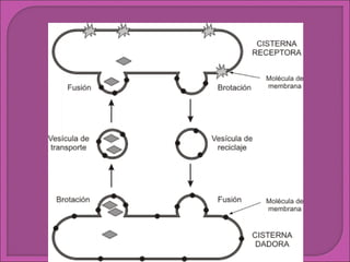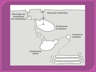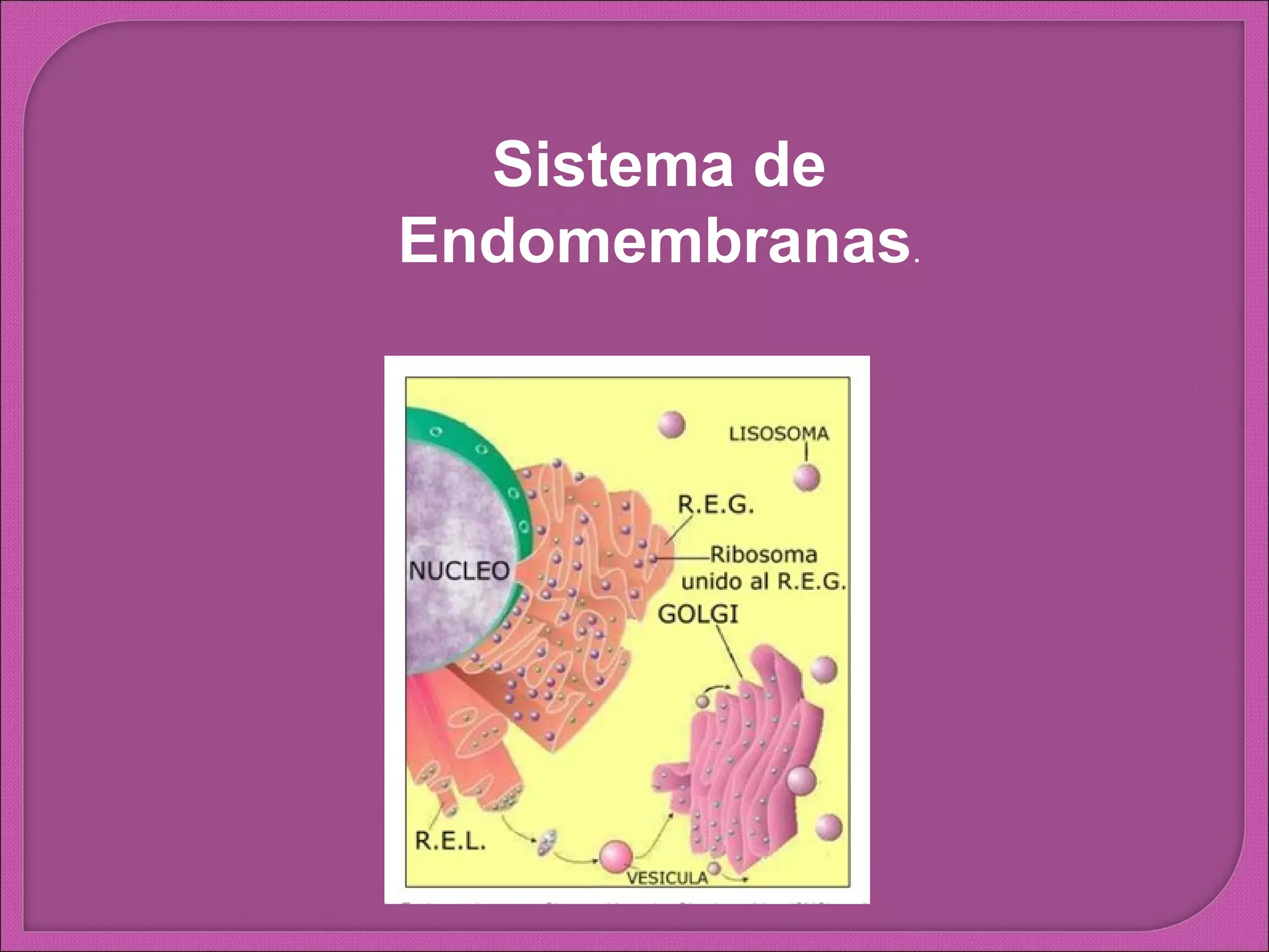 El sistema de endomembranas es un conjunto de estructuras membranosas que incluye el retículo endoplasmático, el complejo de Golgi, los lisosomas y las vesículas de transporte. Estos componentes funcionan de forma coordinada en la elaboración de moléculas de membrana, enzimas lisosomales y proteínas de secreción. El retículo endoplasmático constituye la mayor parte del sistema y desempeña funciones como la síntesis y almacenamiento de proteínas y lípidos.