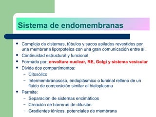 Este documento describe los principales componentes del sistema de endomembranas eucariota. El sistema incluye el retículo endoplásmico, aparato de Golgi, lisosomas y vacuolas. El retículo endoplásmico se divide en rugoso y liso, y desempeña funciones como la síntesis de proteínas y lípidos. El aparato de Golgi procesa y empaqueta moléculas y participa en la secreción celular. Los lisosomas contienen enzimas hidrolíticas y participan en la digestión