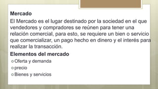 El documento describe los conceptos fundamentales del sistema de mercado, incluyendo la oferta y la demanda, el precio de equilibrio, y los diferentes tipos de competencia como la competencia perfecta y monopolio. Explica cómo la cantidad demandada de un bien depende de factores como el precio, los ingresos de los consumidores, y los precios de bienes relacionados.